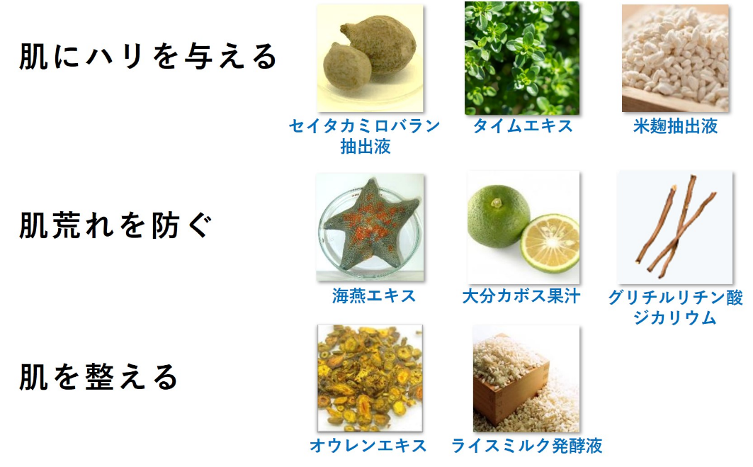 「ライスミルク発酵液」、「タイムエキス」、「大分カボス果汁」、「海燕エキス」など