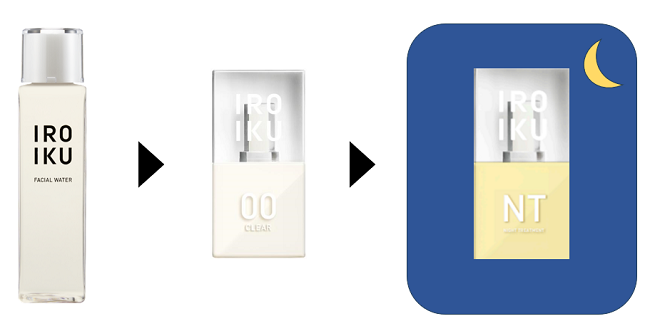 美容成分高配合の化粧水「IROIKU フェイシャル ウォーター」の後、「IROIKU スキンチューンナップ セラム」のクリア(透明)00番をお使いいただき、「IROIKU ナイトトリートメント」という順に、ラインでお使いいただくことで、肌にハリを与え、肌を整える効果が期待されます。(*12)。